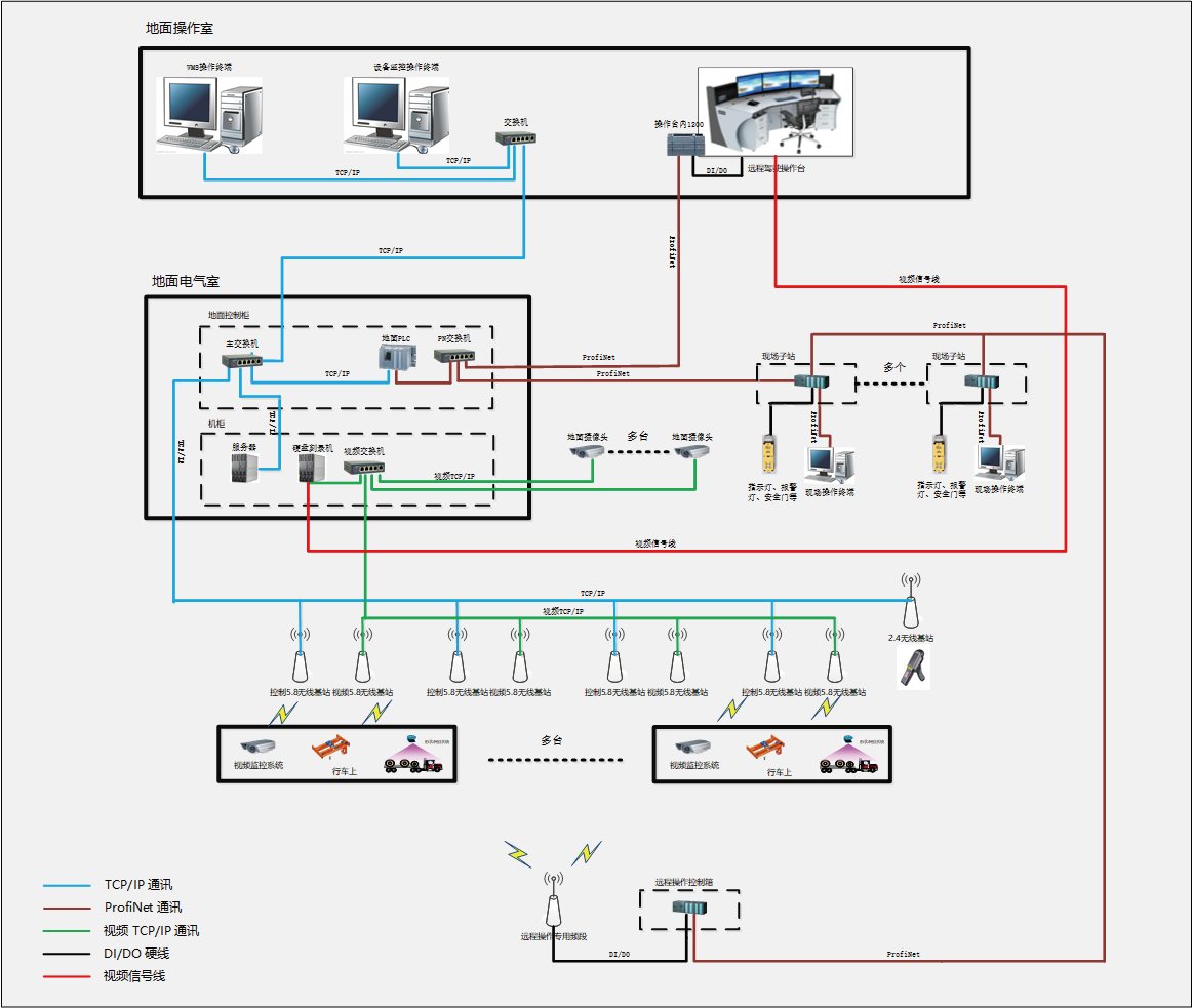 無(wú)人化系統(tǒng)的硬件分布在三個(gè)位置上:天車上、庫(kù)區(qū)里、中控室。各個(gè)部位之間需要通過(guò)有線或者無(wú)線進(jìn)行連接。